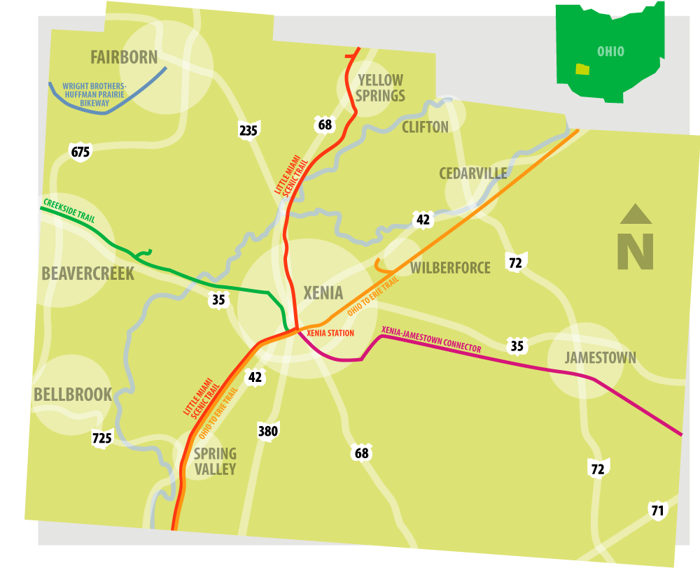 Just south of downtown Xenia is the center of it all. Four out of five of our trails connect so you can get from North to West to South to East – all along the bike trail.